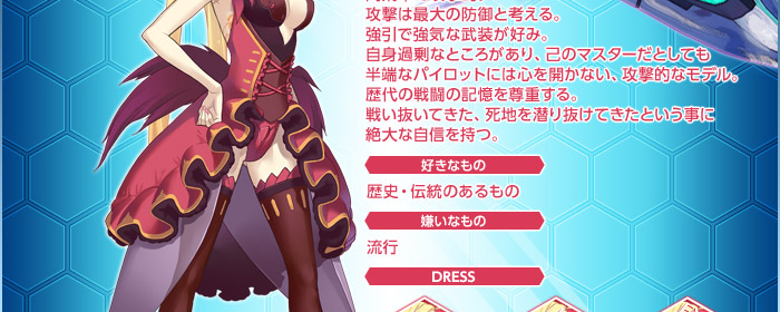 朱理(しゅり) CV:ゆかな 高飛車で攻撃的。 攻撃は最大の防御と考える。 強引で強気な武装が好み。 自身過剰なところがあり、己のマスターだとしても半端な パイロットには心を開かない、攻撃的なモデル。 歴代の戦闘の記憶を尊重する。 戦い抜いてきた、死地を潜り抜けてきたという事に 絶大な自信を持つ。 【好きなもの】 歴史・伝統のあるもの 【嫌いなもの】 流行